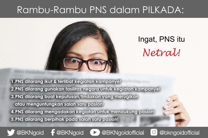 Kepala Biro Humas BKN Mohammad Ridwan menyampaikan bahwa imbauan tersebut sudah tertuang dalam Peraturan Pemerintah Nomor 53 Tahun 2010 tentang Disiplin PNS Pasal 4 (empat) yang menjelaskan bahwa PNS dilarang memberikan dukungan kepada calon Kepala Daerah/Wakil Kepala Daerah melalui keterlibatan dalam kampanye dan keberpihakan yang menguntungkan atau merugikan paslon tertentu.